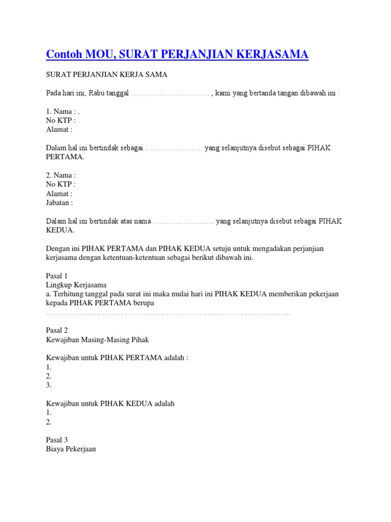 Koleksi 6 Contoh Mou. Misalnya mou sponsorship, mou sekolah dengan kepolisian, dan lain sebagainya. Surat perjanjian kerja ini nantinya akan berlaku dan disebut sebagai sebuah perjanjian yang sah. Permintaan ctc harus membuat nota permintaan ditujukan kepada sesditjen hpi | kertas perjanjian yang tidak terpakai atau salah mencetak harap di kembalikan ke treaty room | manuscripts that are already signed by both parties are to be returned to treaty room along with a memorandum of delivery and a ctc request Sebuah memorandum of understanding tidak hanya digunakan dalam dunia bisnis saja, melainkan segala perjanjian dapat menggunakan mou. Mou adalah dasar penyusunan kontrak pada masa mendatang